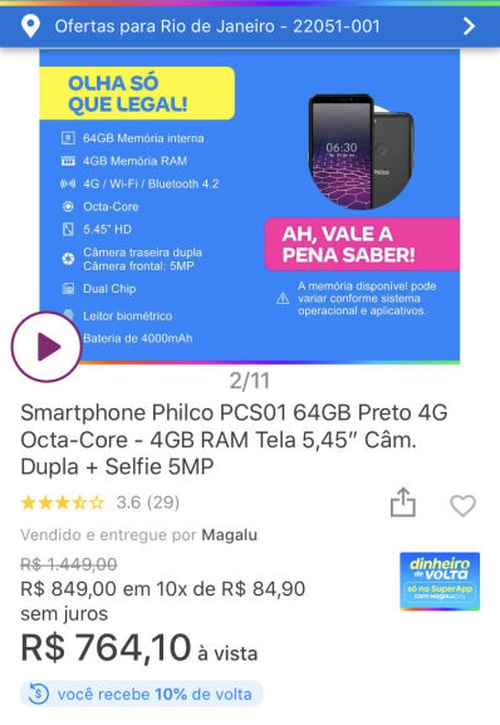 Valor R$764,10 - Cashback R$76,01 = R$687,69