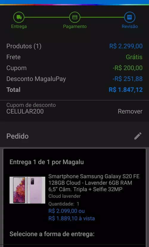Válido no app, cupom + magalupay, se celular200 não funcionar, tente MAGALU200, pra quem não conseguir de primeira façam o seguinte, coloquem o produto no carrinho, selecionem pix e coloquem o cupom MAGACOMPRA, após o valor atualizar para 1847, saiam do app e voltem, o produto já vai estar no carrinho com desconto, ai é só selecionar magalupay e ele vai pra 1847. OBS: tem que ter o saldo total para entrar no magalupay, mas o valor final vai ficar 1847.