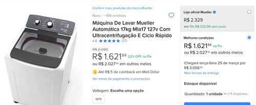 Máquina De Lavar Mueller Automática 17kg Mla17 127v Com Ultracentrifugação E Ciclo Rápido