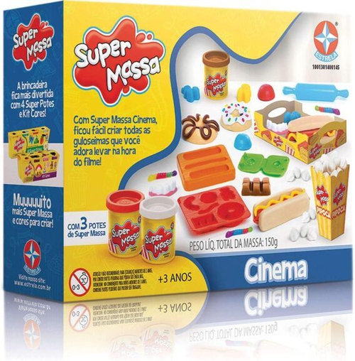 Contém na Embalagem: 1 Forma 3D de Pipoca, 1 Molde com Formato de Balas, 1 Molde com Formato de Pães e Salsicha, 1 Rolinho, 1 faca, 1 Bandeja Cartonada, 1 Balde de Pipocas Cartonado e 3 Potes de Massa 50g.