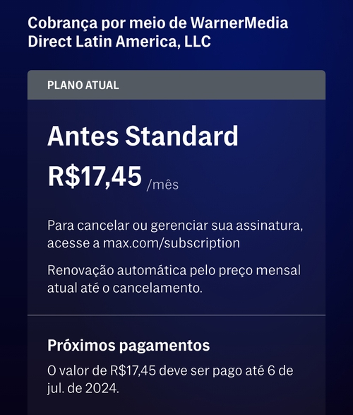 > Após o período de assinatura com os preços promocionais, sua assinatura será renovada automaticamente a cada ano para o plano que você assinou pelo preço anual atual naquele momento sem o desconto promocional de forma recorrente, a menos que você cancele. Para cancelar sua assinatura, consulte “Assinatura” em sua conta Max. Caso mude de plano durante o período promocional, benefícios, economias, testes gratuitos ou descontos específicos para o seu plano atual não serão aplicáveis ao seu novo plano. Não haverá reembolso ou crédito por anos parciais. Ofertas válidas apenas em Brasil. Termos e condições da Oferta na íntegra em max.com.