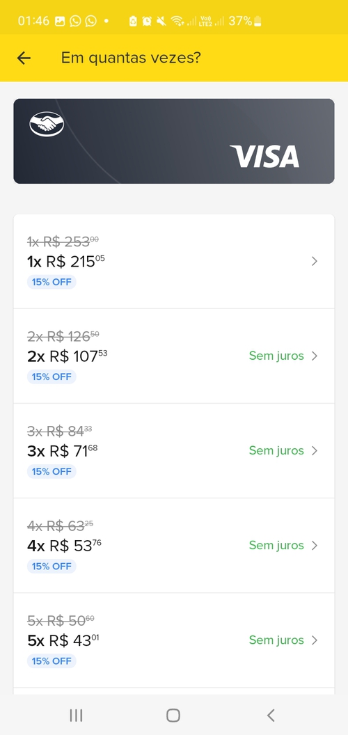 Aqui não deu 15% com o cartão MP não e nem muito menos parcelou sem juros 😪😪