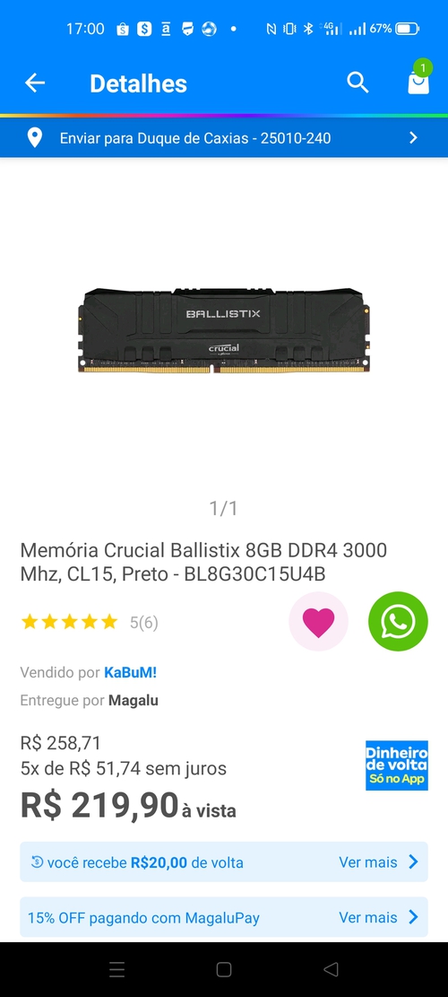 À vista. Pelo aplicativo pode sair frete grátis. E está tendo retorno de 20 reais