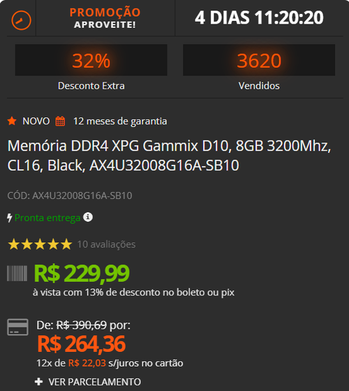 Memória DDR4 XPG Gammix D10, 8GB 3200Mhz, CL16, Black, AX4U32008G16A-SB10