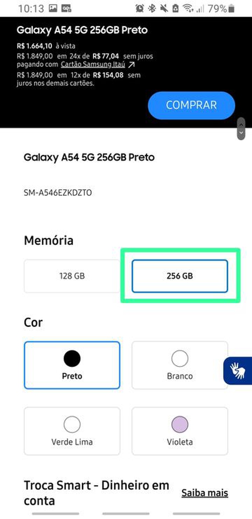 - Na lista só aparece o a54 128gb mas dentro tem a opção do 256gb.