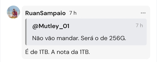 Esse post não ajuda em nada, já postaram mais cedo, e apagaram a "promoção", pois só está confundindo a cabeça de quem tem interesse em adquirir um produto. Certamente quem comprar, tera problemas, pois foi um erro de título no site, e a Samsung, não enviará o de 1Tb. Quem quer ter dor de cabeça, é só efetuar a compra.
