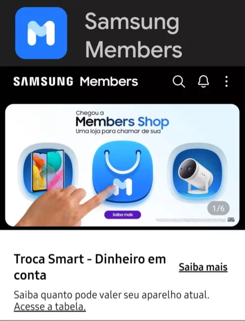 É necessário ter um aparelho Samsung, e instalar o app Samsung Members. Dentro do app Samsung Members, clique no banner Members Shop!