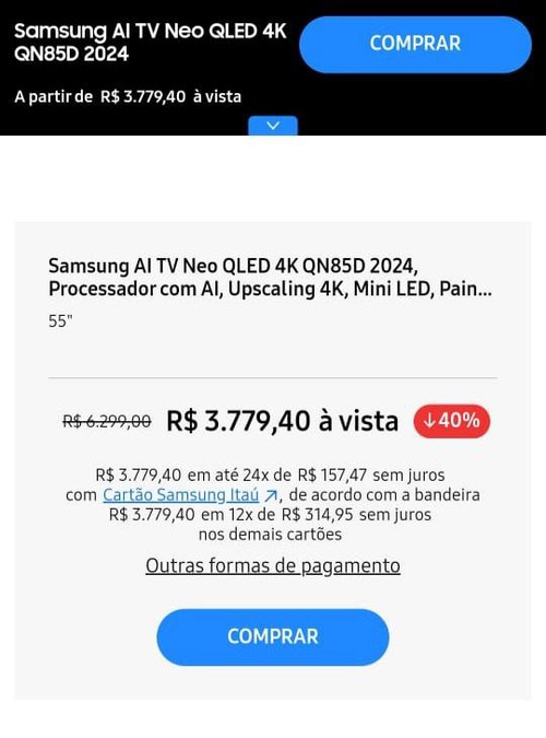 Samsung não para de cair o preço, peguei a gaming 50" por 4.4, e já apareceu por 3.8, e agora essa por 3.7. Pena que não comprei no cartão com seguro de preço, se não já teria devolvido. Adiantou nada a campanha de inscrição na pré-venda.