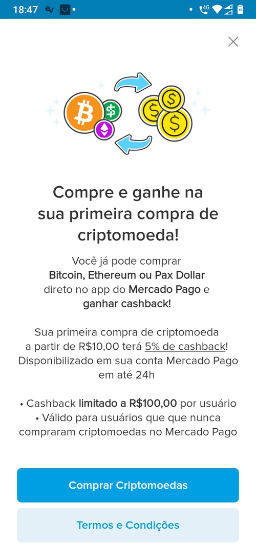 Sua primeira compra em criptomoedas no mercado pago te dará 5% de casback limitado a 100 R$ de Volta !!!
