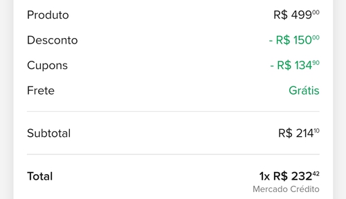 Aqui deu certo o cupom, mas na hora de pagar eles estão cobrando 25 reais a mais que o valor final com desconto 🤡