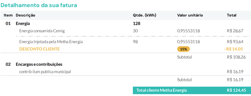 Eu tenho. Depende do seu uso. Eu estou no limite inferior de quem consegue usar o serviço (~130kWh).Tem sempre uma quantidade de 30 kWh que não tem desconto, e o desconto é só sobre a energia injetada pela Metha. Vem só um boleto deles pra pagar tudo (não precisa pagar mais o boleto da CEMIG). Eles demoraram uns 2 meses pra conseguir começar a usar (tem toda uma burocracia). Dá uns 15 reais de desconto por mês no meu caso: