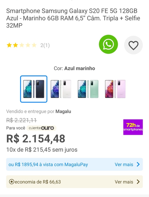 [Mgpay] Smartphone Samsung Galaxy S20 FE 5G 128GB Azul