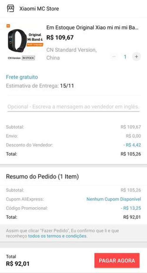 Outra coisa, sobre a taxação, a chance de taxar a Mi Band 4 é quase NULA!!! a única taxa que você tem que ter um mente é a de 15 reais do correio.