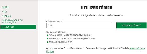 Após a compra, basta ir no site do Minecraft, em https://www.minecraft.net/pt-pt/profile/redeem (vide ilustração), inserir o código obtido na compra e resgatá-lo!