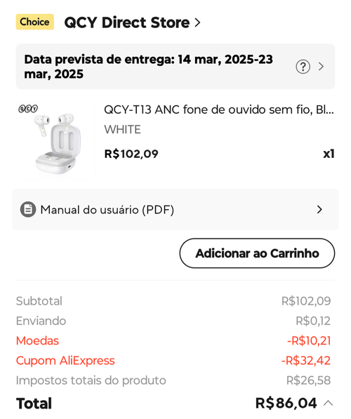03 Passo: Vá até a área de moedas e procure pelo fone de ouvido QCY t13 ANC no valor de 102 reais (fone com 30% de utilização das moedas sobre o valor do produto)