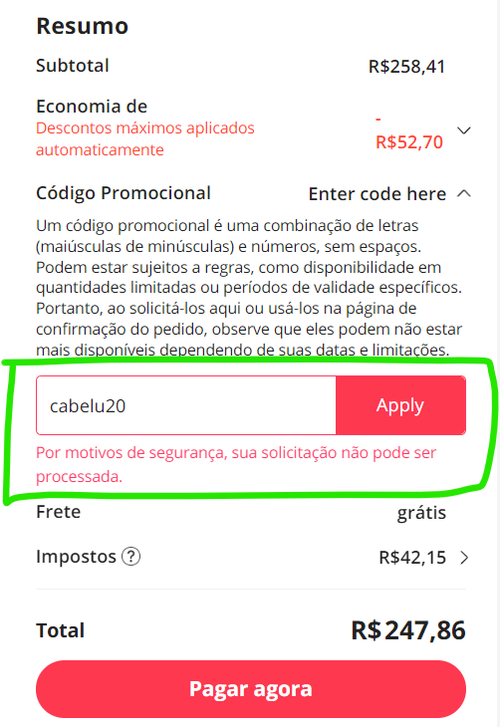 Toda compra que tento usar cupom digitado (cabelu20, elo20, agora20) da mensagem de problema de segurança. Alguém sabe pq? Já faz uns 3 dias isso. Consigo fechar as compras se não usar o cupom, mas né, a ideia é usar.