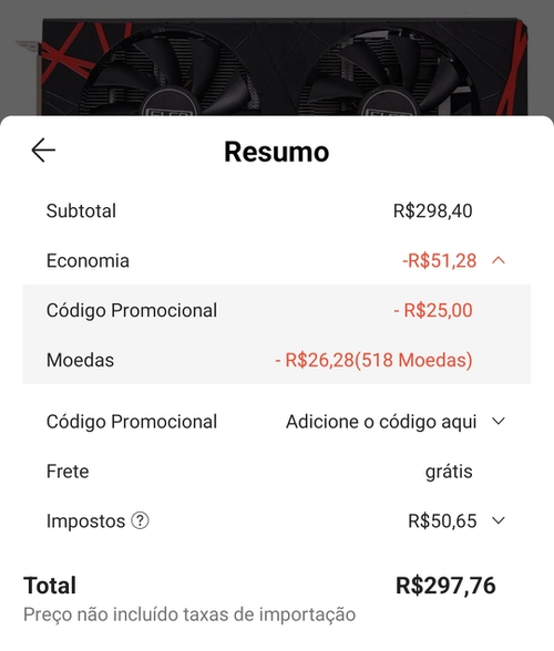 Aqui tá 500 com cupom e moedas ativadas também, 258 de imposto