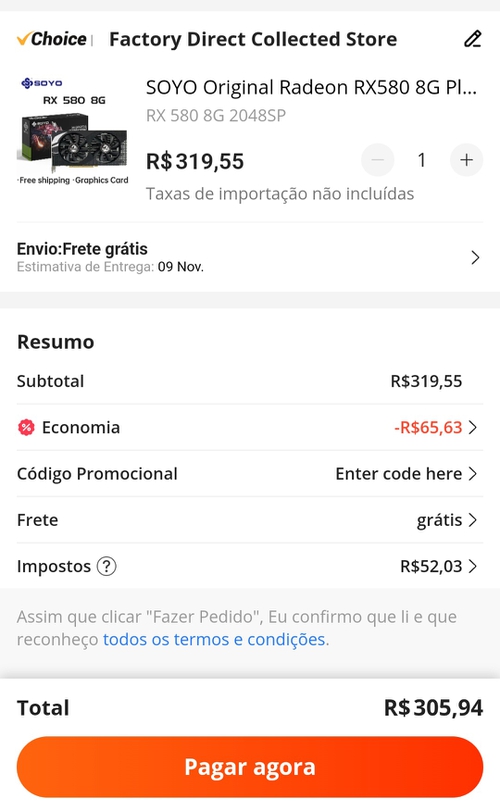 Ficou em mais de 550, mas depois que coloquei o cupom caiu para 316 com imposto incluso.