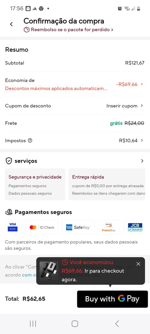 Pra mim ficou 62,65 (1140 moedas). Não precisei inserir o cupom, pois o 10,00 veio automaticamente.