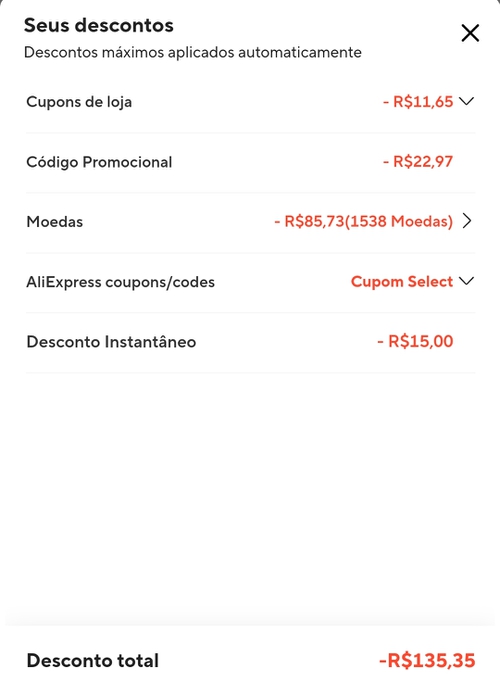 É necessário seguir a loja para ganhar 2 dólares de desconto, 1538 moedas para obter 85,73 reais de desconto, aplicar o cupom informado e pagar via Google Pay. Segue todos os descontos abaixo: