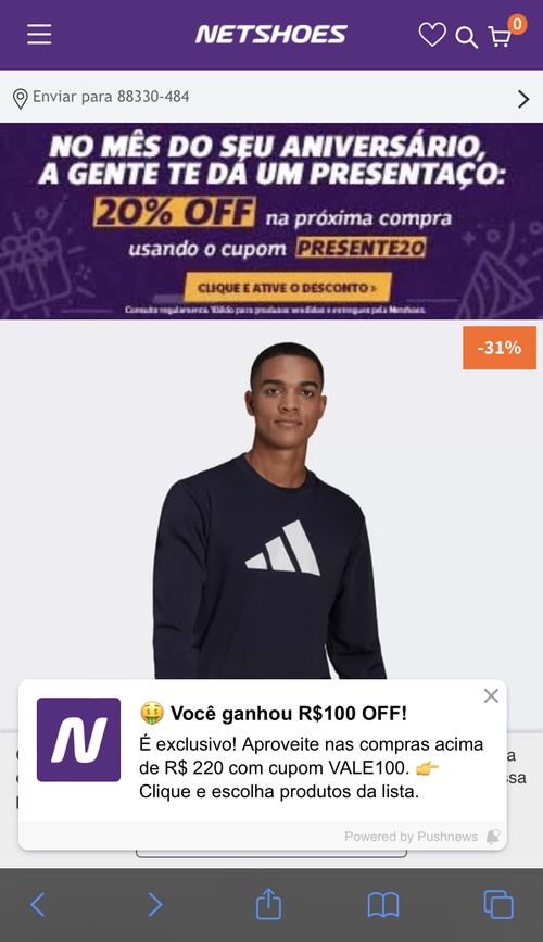 Promoção ativa, se tiver conta na Netshoes há algum tempo e autorizou receber e-mails, procure no seu e-mail "100 para te ajudar no 🎁"
