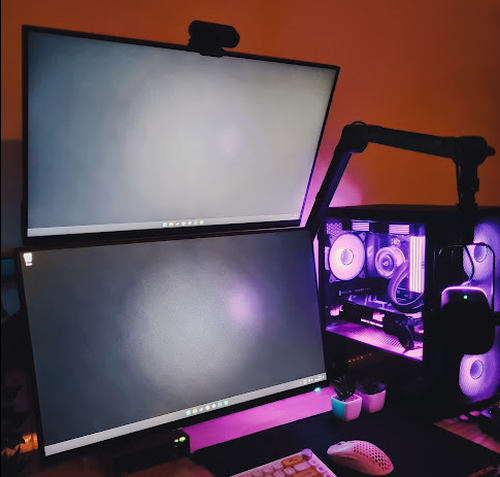 uso dois monitores em stand (em cima do outro) e posso afirmar q a ideia de ter dois monitores em stand totalmente retos é péssimo. vc sempre vai querer ou enclinar o de cima pra baixo ou enclinar ambos para o centro, de forma com que sua visão alterne em alguns graus para visualização. ter um monitor desse tamanho totalmente reto só vai funcionar "ok" se ele estiver no minimo a uns 80cm de distância (pra mais). caso contrário, vai ser absurdamente desconfortável em pouco tempo de uso