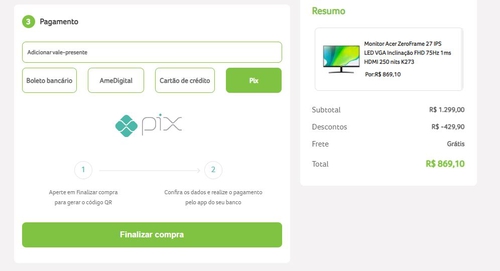 Monitor Acer ZeroFrame 27 IPS LED VGA Inclinação FHD 75Hz 1ms HDMI 250 nits K273