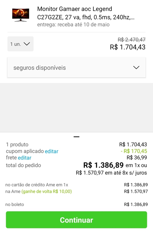 GENTE, cosegui gerar boleto desse garotão! Tem que ser no app. Eu fui pela pesquisa do Google mesmo, não usei o Pelando. Encontrei o mesmo monitor no valor de 1499,90 com cupom fica no 1387 reais, mais o frete deu 1419 no total.