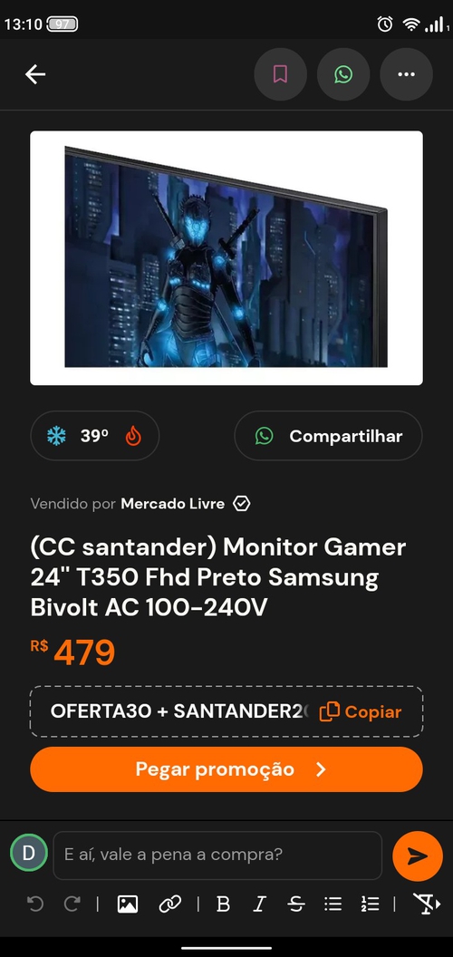Conte também com a ajuda da nossa comunidade para localizar os vendedores corretos, para aplicar cupons e, claro, para fazer as melhores decisões de compras! Nosso time também está disponível no chat para tirar quaisquer dúvidas que possam surgir. Abraços! 🔥