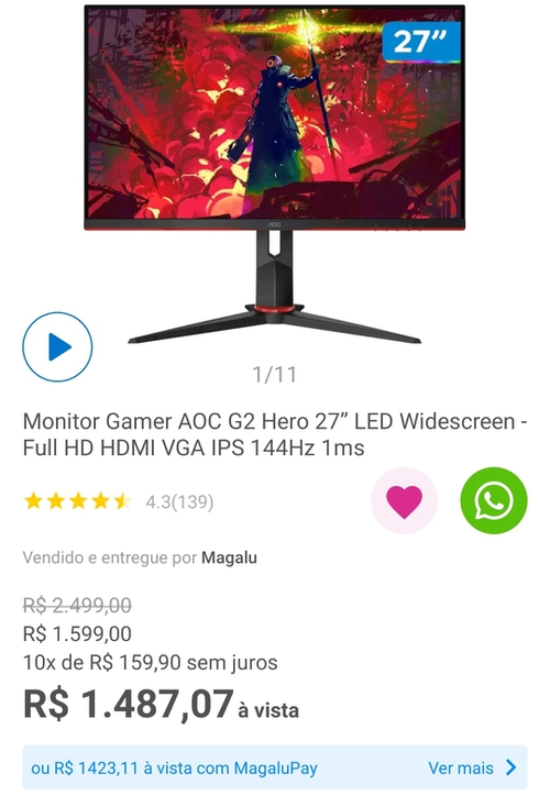 Peguei ele por R$1.050 no ML esta semana e já entregaram. Houve um bug em que os modelos de 24" e 27" ficaram com o mesmo preço por algumas horas, como já estava monitorando ele, consdegui pegar.