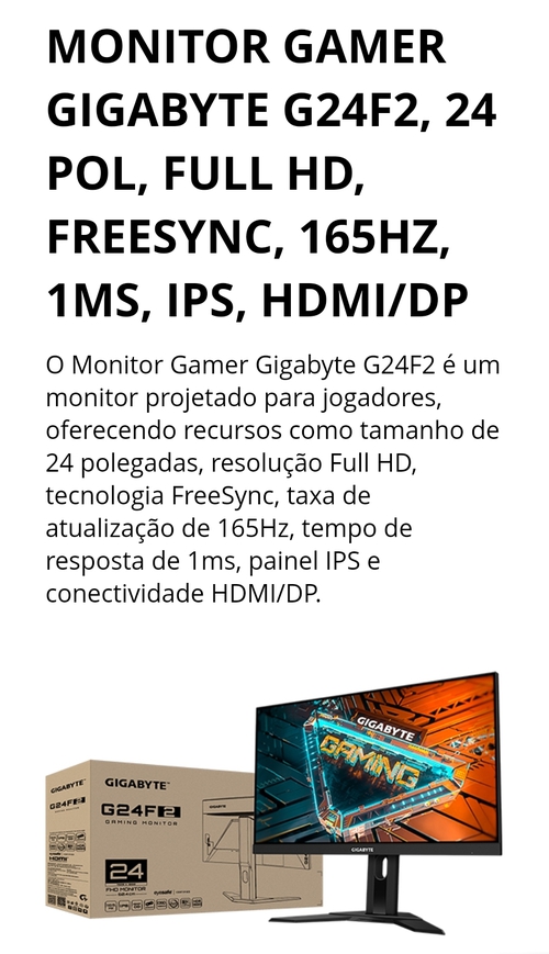 Monitor Gamer Gigabyte G24F2, 24 Pol, Full HD, FreeSync, 165Hz, 1ms, IPS, HDMI/DP