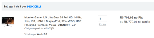 Monitor Gamer LG UltraGear 24 Full HD, 144Hz, 1ms, IPS, HDMI e DisplayPort, 99% sRGB, HDR, FreeSync Premium, VESA - 24GN60R