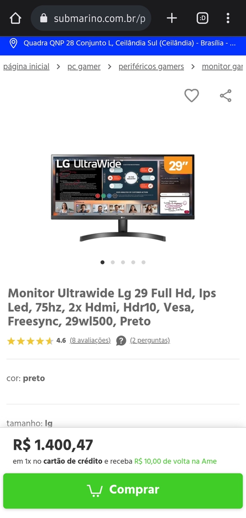 Monitor Ultrawide LG 29 Full hd, ips led, 75Hz, 2x hdmi, HDR10, vesa, FreeSync, 29WL500, Preto
