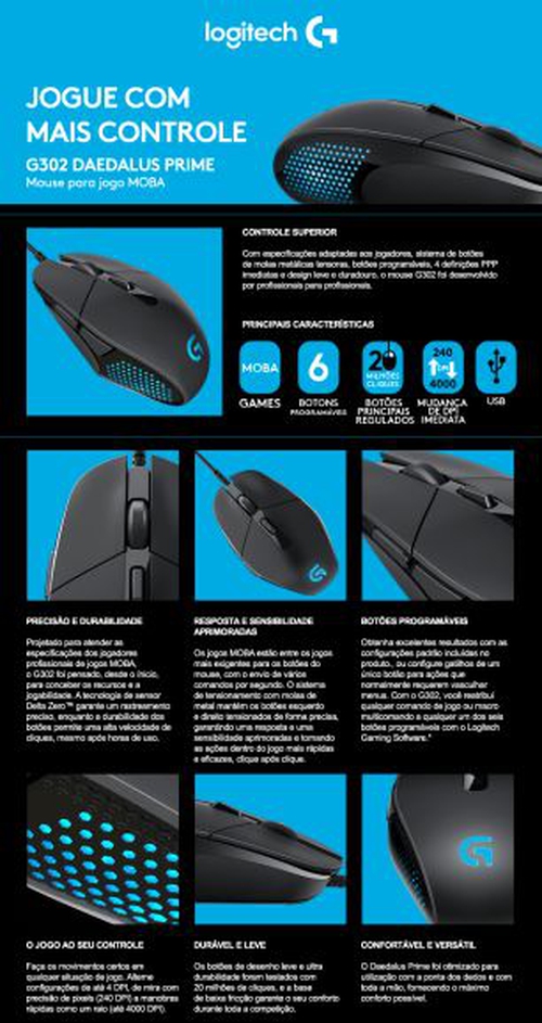 Mouse Gamer G302 Daedalus Prime 4.000 DPI PC - Logitech - R$90