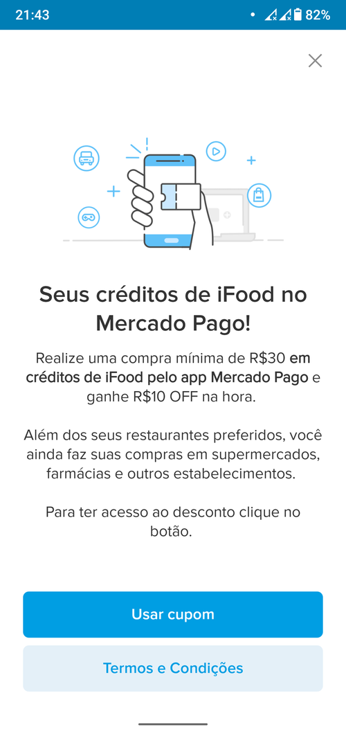 "Válido para a primeira compra de crédito de iFood realizada no app Mercado Pago. Um único cupom por usuário." coloca aí nas regras