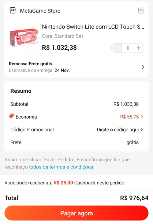 Resgatar cupom da loja METAGAME2, valor final aparece na página de pagamento conforme imagem abaixo.