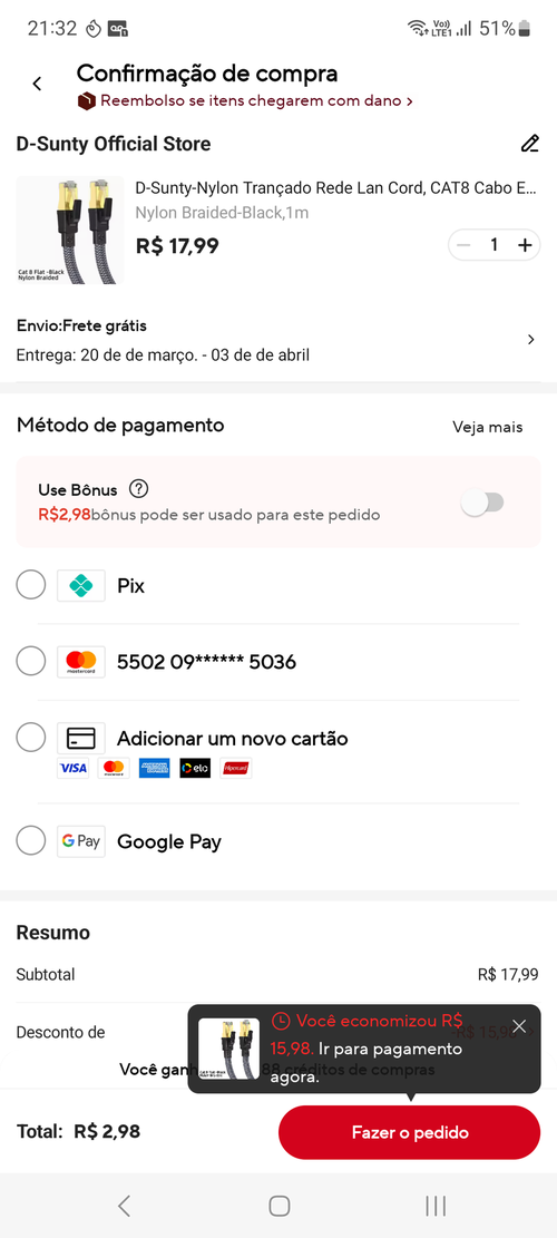 Quis aproveitar o cupom e pegar um cabo de rede um pouco maior.