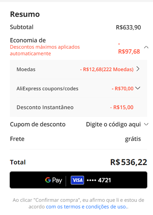 Produto já está no Brasil. Pra quem tem moedas, dá pra economizar mais R$17,86 (336 moedas), e pagando com Google Pay, tem R$15 OFF, chegando em R$492. Qualquer dúvida é só me avisar