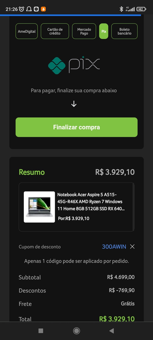 Aqui o cupom 300AIWN não aplicou, mas aplicou o 300off