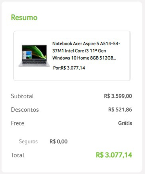 Notebook Acer Aspire A514-54-37M1 Core i3 11ª 8GB 512GB SSD 14" IPS