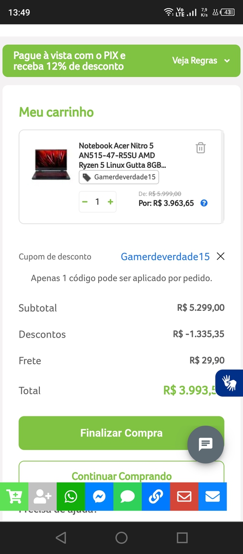 Notebook Acer Nitro 5 Ryzen 5 7535HS Linux 8GB 512GB SSD RTX 3050 15.6” Full HD
