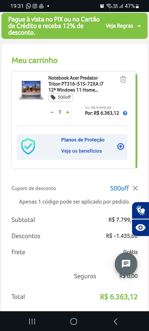 Notebook Acer Predator Triton i7 12ª RTX3060 6GB RAN 16GB 512GB SSD Win 11