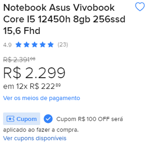 Notebook Asus Vivobook Core I5 12450h 8gb 256ssd 15,6 Fhd