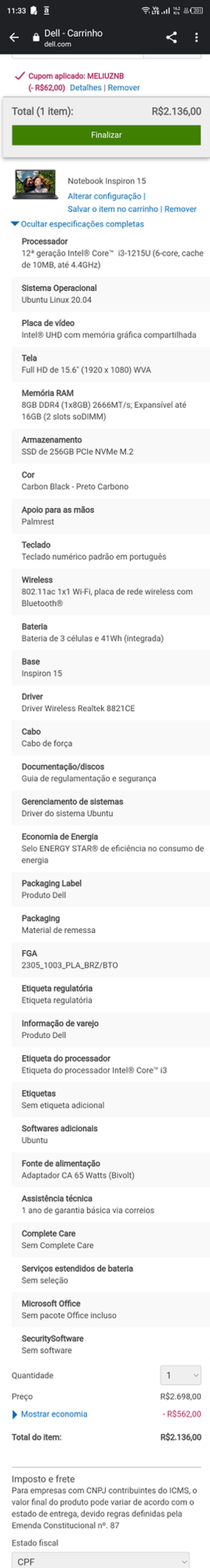 Notebook DELL Inspiron i3 1215U 8GH 256GB 15,6 LINUX