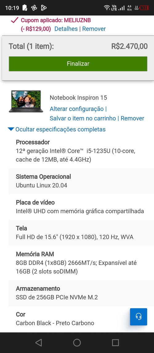 Notebook Dell Inspiron. i5 1235u 15,6WVA 120Hz8gb 256gb Linux