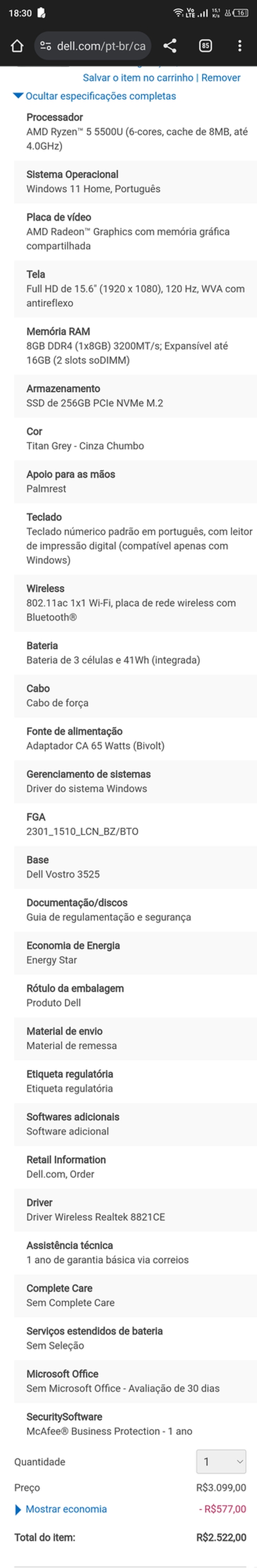Notebook Dell Vostro 3525 R5 5500u 15,6 WVA 120HZ 8GB 256GB W11 BIOMETRIA