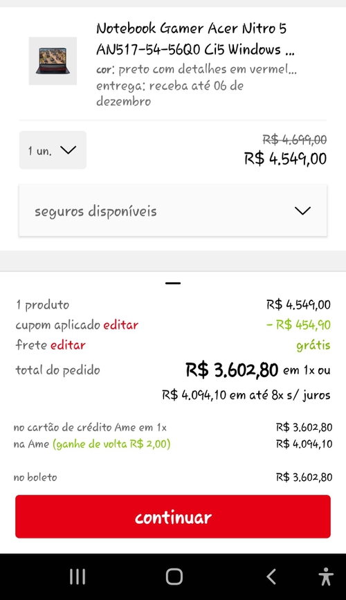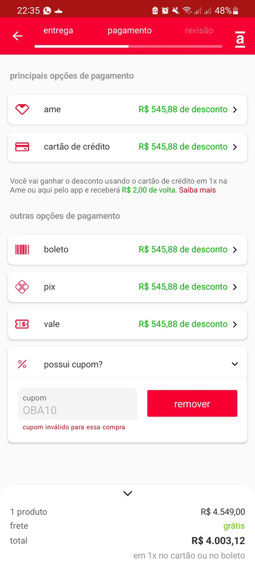 Compra pelo app, pagamento em 1x no cartão ou boleto.