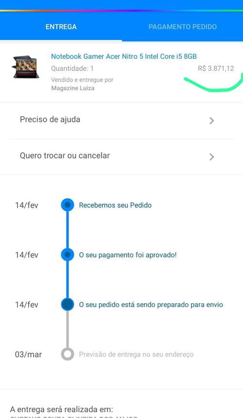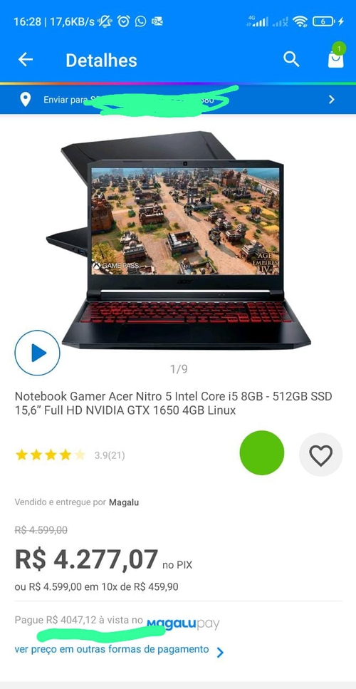 Notebook Gamer Acer Nitro 5 Intel Core i5 8GB saindo a R$ 3.671,12 usando a conta MagaluPay + cupom de R$ 200,00.