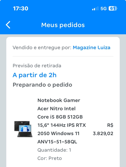 Notebook Gamer Acer Nitro Intel Core i5 8GB 512GB 15,6 144Hz IPS RTX 2050 Windows 11 ANV15-51-58QL