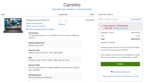 Comprei o meu Dell g15 por um preço muito bom ligando para a central de vendas e conversando com um vendedor. Eles costumam dar um desconto a mais junto com o cupom, ou pelo uma bolsa de brinde.